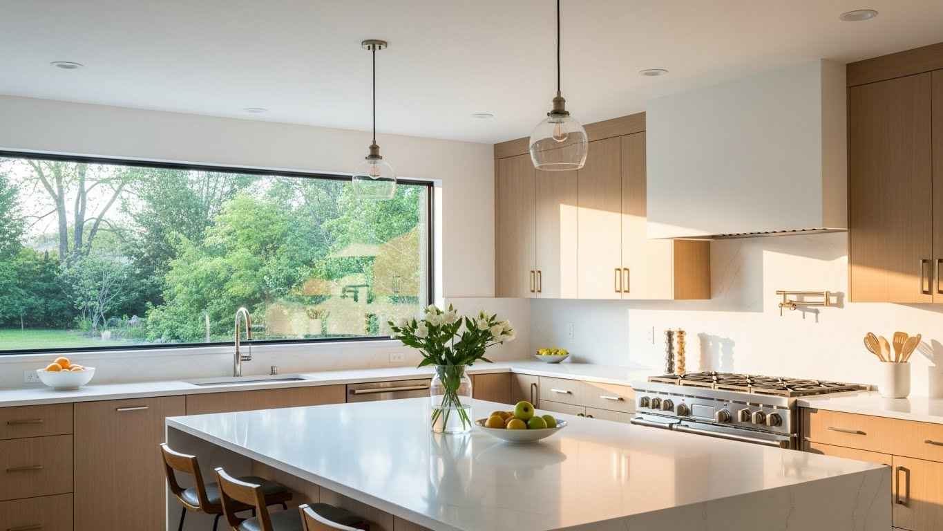 Corner windows open up two walls at once. They create a panoramic effect that makes a kitchen feel expansive. This layout is great for corner sinks or dining nooks. It brings in light from two different directions throughout the day. Create a panoramic effect with this layout. You can mimic this by placing two standard windows close together on adjacent walls. This gives a similar, light-filled corner.